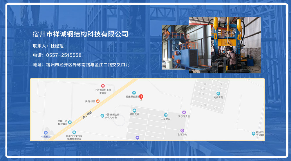 宿州市祥誠鋼結構科技有限公司位于宿州市經開區外環南路與金江二路交叉口北,公司是一家以建設產業化為目標,匯集大型鋼結構廠房、彩鋼活動房設計、制作、安裝施工一條龍服務的知名鋼結構公司。公司現有固定資產1000余萬元、流動資金近千萬元公司。現有員工40人,大專以上學歷30人,其中高級工程師1人、工程師2人、會計師1名。各工種持證上崗率100%。高效化的年青團隊為公司帶來了蓬勃發展的動力,全體員工以務實的態度,拼搏的精神,創造著企業的每一天。      公司組織結構嚴格按現代企業制度設計,管理機構設置合理,制度完善,各部門分工明確...